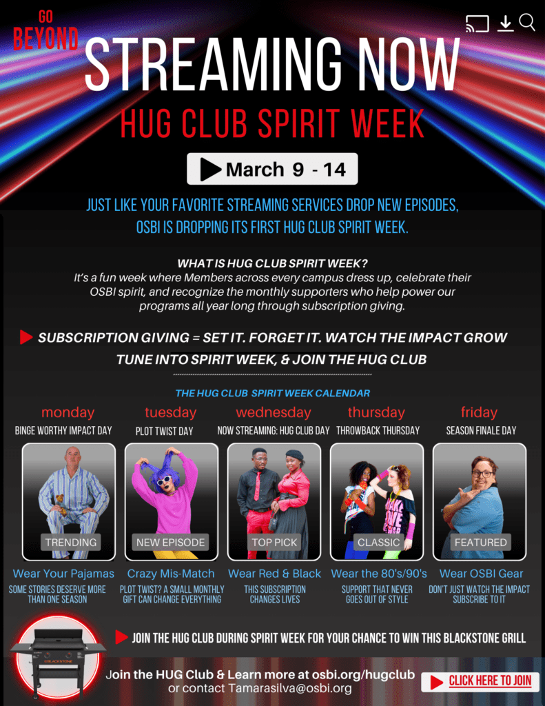 HUG Club Spirit Week is a fun week for OSBI Members across every campus to show their OSBI spirit by dressing up, and to recognize the monthly supporters who help power our programs all year long through subscription giving. At the same time, families and community members can show their support by joining the HUG Club or spreading the word about the HUG Club.